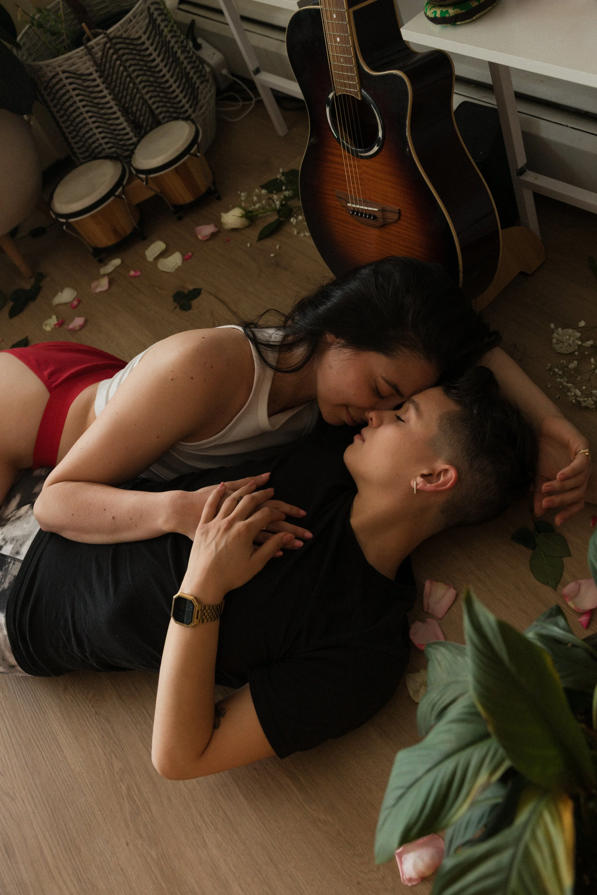 Our minimum for boudoir shoots is one hour, because we never want to rush a vulnerable process. That being said, our recommendation would be to account for at least 20 minutes per outfit or scene. For example, if you’re planning to shoot in the kitchen, then living room, an hour sounds doable and gives time for one-two outfit changes, experimenting, and goofs. But, if you want to integrate more scenes, outfits, people, or activities, two hours is really the way to go!